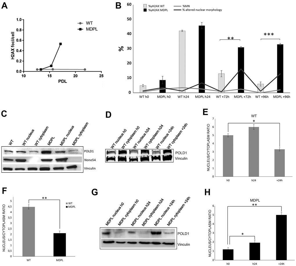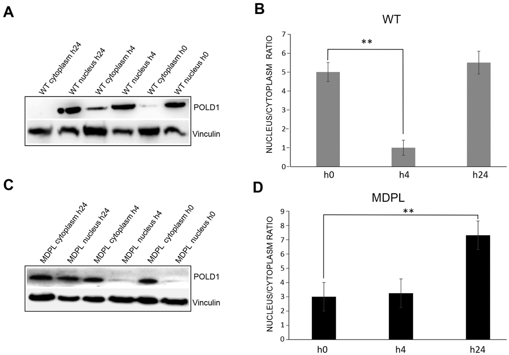 Polδ expression has been evaluated both at basal level and after cisplatin treatment. We compared MDPL-HDFs versus WT ones by Western blotting analysis, after a nuclear fractionation experiment for separating the nucleoplasmic fraction from the cytoplasmic one. The correct fractionation was checked by using a nuclear marker (nono54) (Figure 3C). At basal level, the nuclear to cytoplasmic ratio of Polδ protein shows a strong decrease in MDPL cells, if compared to WT ones (P<0.01) (Figure 3C, 3F). In Figure 3D the same protein analysis was done after cisplatin treatment. Right after the drug exposure (h24), Polδ nuclear to cytoplasmic ratio of WT cells resulted to be slightly increased than the basal condition, before declining under the basal value after 24 hours (+24h) from drug removal (Figure 3D, 3E; P<0.05). This trend varied in a different manner in MDPL-cells where Polδ ratio showed a progressive increase both immediately after cisplatin treatment (h24, P<0.01) and after 24 hours (+24h) from drug removal (Figure 3G, 3H; P<0.01).