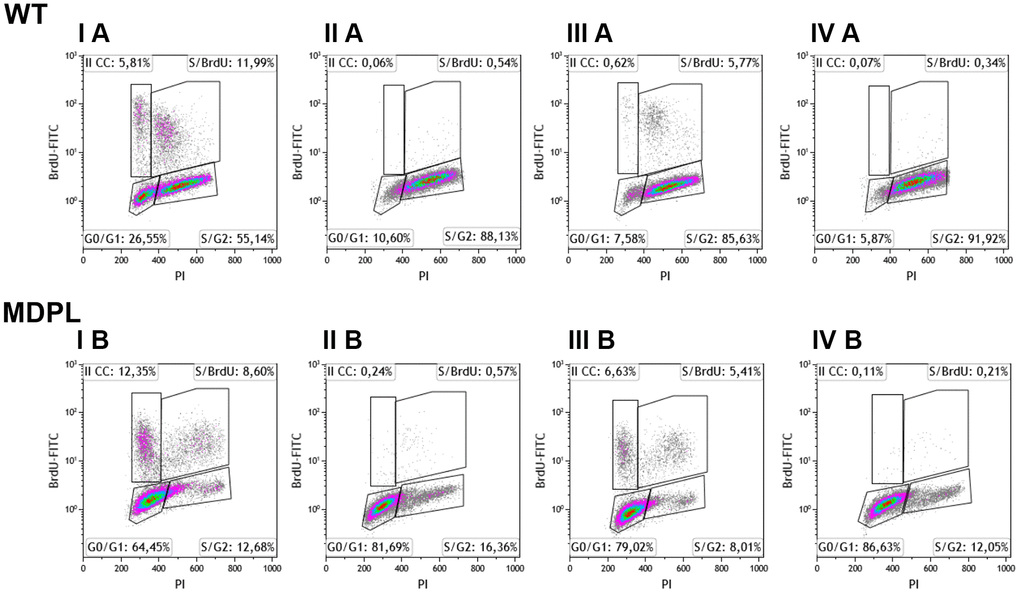 To further explore and compare the distribution profiles between the MDPL and WT cells in the various phases of the cell cycle (G0/G1, S and G2), flow cytometric analysis was performed after BrdU incubation. Results are shown in Figure 4. WT HDFs enter (about 18%) in cell cycle with a subpopulation of proliferating cells (~ 6%) and are also able to re-enter in a second cell cycle (II CC). More than 80% of cells are not cycling cells but they remained distributed in G0/G1 (~ 26%) and S/G2 (~ 55%) (IA).