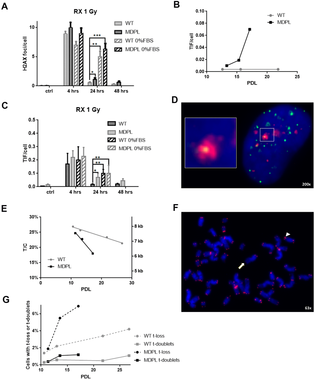 On the same chromosome spreads where we measured telomere lengths, we also took note of those chromosome arms that showed no telomeric signal (telomere loss) or disrupted signals (telomere doublets), strongly considered as marker of telomeric replication stress (Figure 6F, 6G). Figure 6G clearly shows that telomere loss paralleled telomere shortening and telomere doublets showed an earlier increase in MDPL HDF.