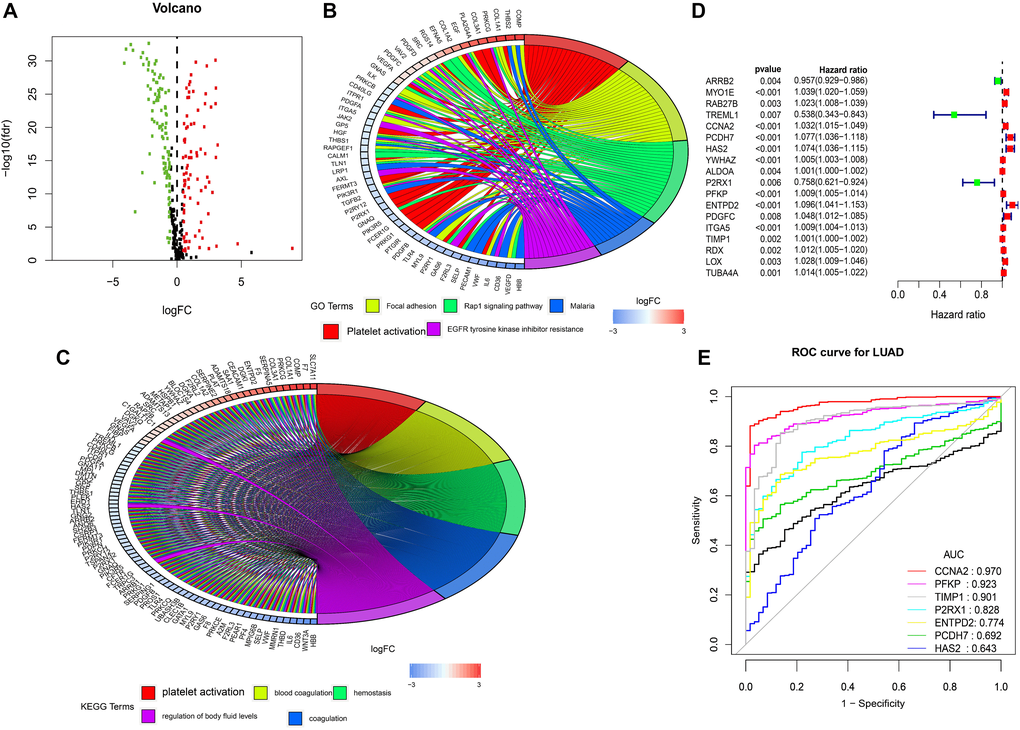 In recent years, the incidence of adenocarcinoma has proliferated, and adenocarcinoma has replaced squamous cell carcinoma as the most prevalent type of NSCLC [4]. LUAD progresses rapidly with a high degree of malignancy. Patients who show clinical symptoms and signs are often at an advanced stage, causing an onerous burden on both themselves and society. Studies [5, 6] have shown that platelets play a non-negligible role in tumor metastasis, and there is a correlation between platelet count and cancer prognosis. Platelets are known to be involved in pathophysiological processes such as inflammation, vascular hemostasis, thrombosis and atherosclerosis [7]. There is also considerable evidence that platelets aggregate and activate malignant tumors [8]. They are also associated with distant tumor metastasis. Antiplatelet drugs (such as heparin) inhibit tumor metastasis, suggesting that inhibiting platelet activation may become a target for tumor treatment.