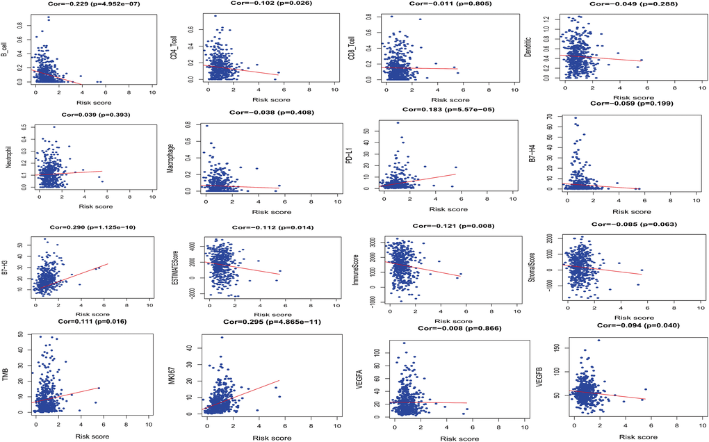 Correlation analysis between PRS and immune cell infiltration showed that PRS and B_cell or CD4 T_cell (Cor = –0.229, P = 4.952e-07 and Cor = –0.102, P = 0.026) were related, and correlation analysis between PRS and immune checkpoints showed that PRS and PD-L1 (Cor = 0.183, P = 5.575e-05) were related. PRS was negatively correlated with ESTIMATE score (Cor = –0.112, P = 0.014), indicating that PRS was positively correlated with tumor purity of LUAD. PRS was positively correlated with the MKI67 score, which proves that the high-risk group may be closely related to the regulation of cancer cell cycle and cancer cell proliferation (Cor = 0.295, P = 4.865e-11). (Figure 4).