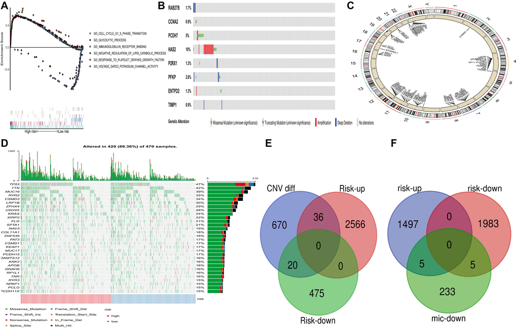 CBioportal database (http://www.cbioportal.org/) shows that among the 8 genes, HAS2 has the highest mutation rate of 10%. (Figure 5B) TTN and MUC16 were detected with high mutation frequencies in tumors expressed in the high-risk group, and they are well-known tumor-associated genes (Figure 5D). This demonstrates that PRS distinguishes mutant genes with poor prognosis. Figure 5C shows the differential copy number in PRS high and low risk, which get copy number in chromosomes 10, 11, 12 and 20, and mitigated in 8, 10, 11 and 12. Among them, the copy numbers of 36 and 20 genes in the high and low-risk groups, respectively, also changed (Figure 5E). The differential expression genes of PRS between high and low expression levels are affected by copy number variation, which indicates that there is no independence between the abnormal copy number expression genes and the differential expression genes of PRS.