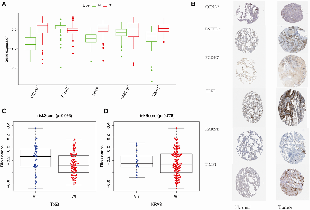 By analyzing the HPA (http://www.proteinatlas.org) and TCPA (http://tcpaportal.org) protein databases, we found that the protein expression of related genes constructed by PRS was also consistent with the previous results. (Figure 6A and 6B) Finally, we verified the relationship between PRS and TP53 mutations and KRAS mutations on GSE13213 data sets and found that the risk score was not affected by these two gene mutations. (Figure 6C and 6D).