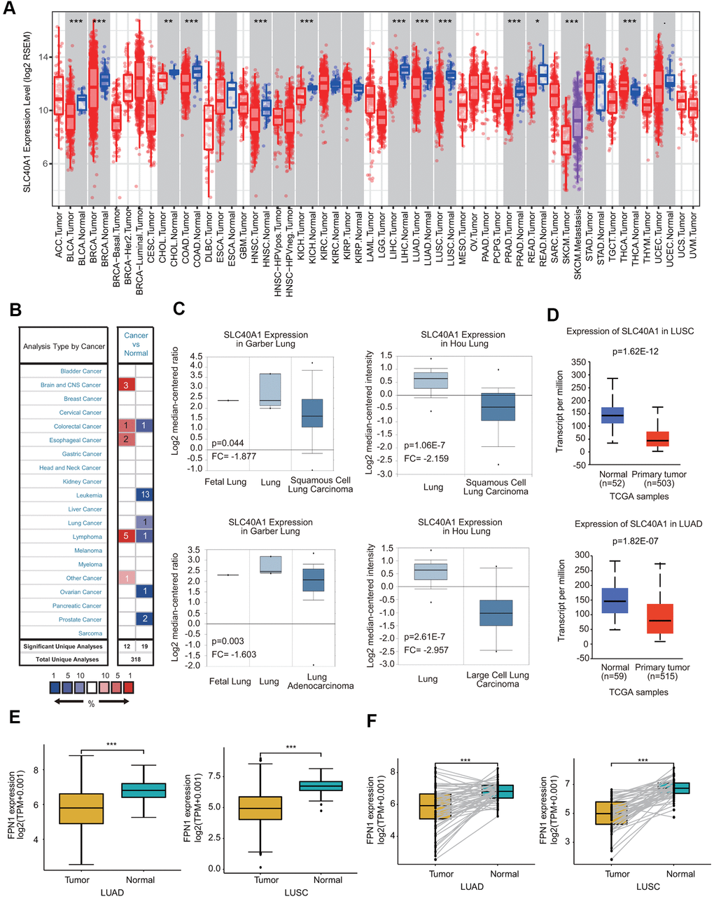 We assessed FPN1 expression levels in malignant and matched paracancerous tissues using the TIMER database. The FPN1 mRNA levels in BRCA, BLCA, COAD, CHOL, HNSC, KICH, LUSC, LUAD, LIHC, PRAD, READ and SKCM were obviously decreased compared with those in their corresponding paracancerous tissues (Figure 1A). FPN1 transcriptional levels in multiple human cancers were also examined through the Oncomine online database. The database contains 31 significant, unique analyses. In 19 of the 31 unique analyses, FPN1 expression was downregulated, whereas in 12 unique analyses, FPN1 expression was upregulated compared to that in normal lung tissues. In a dataset from Garber et al., FPN1 expression levels in NSCLC, including LUSC and LUAD, were remarkably decreased compared with those in normal tissues (Figure 1C). In a dataset from Hou et al., FPN1 expression in LUSC and LCLC tissues was decreased (Figure 1C). Additionally, in a dataset by Selamat et al., FPN1 mRNA expression in LUAD was significantly reduced (Supplementary Figure 1A). The UALCAN and GEPIA databases were used to further confirm FPN1 expression in lung cancer (Figure 1D and Supplementary Figure 1B). Moreover, FPN1 expression in lung cancer and normal or paracancerous lung tissues was also confirmed through The Cancer Genome Atlas (TCGA), and the results demonstrated that FPN1 mRNA levels were greatly reduced in lung cancer tissues (Figure 1E). In addition, FPN1 expression in 50 paired lung cancer patients and normal individuals was analyzed. The mRNA level of FPN1 was consistently downregulated in both LUSC and LUAD samples (Figure 1F).