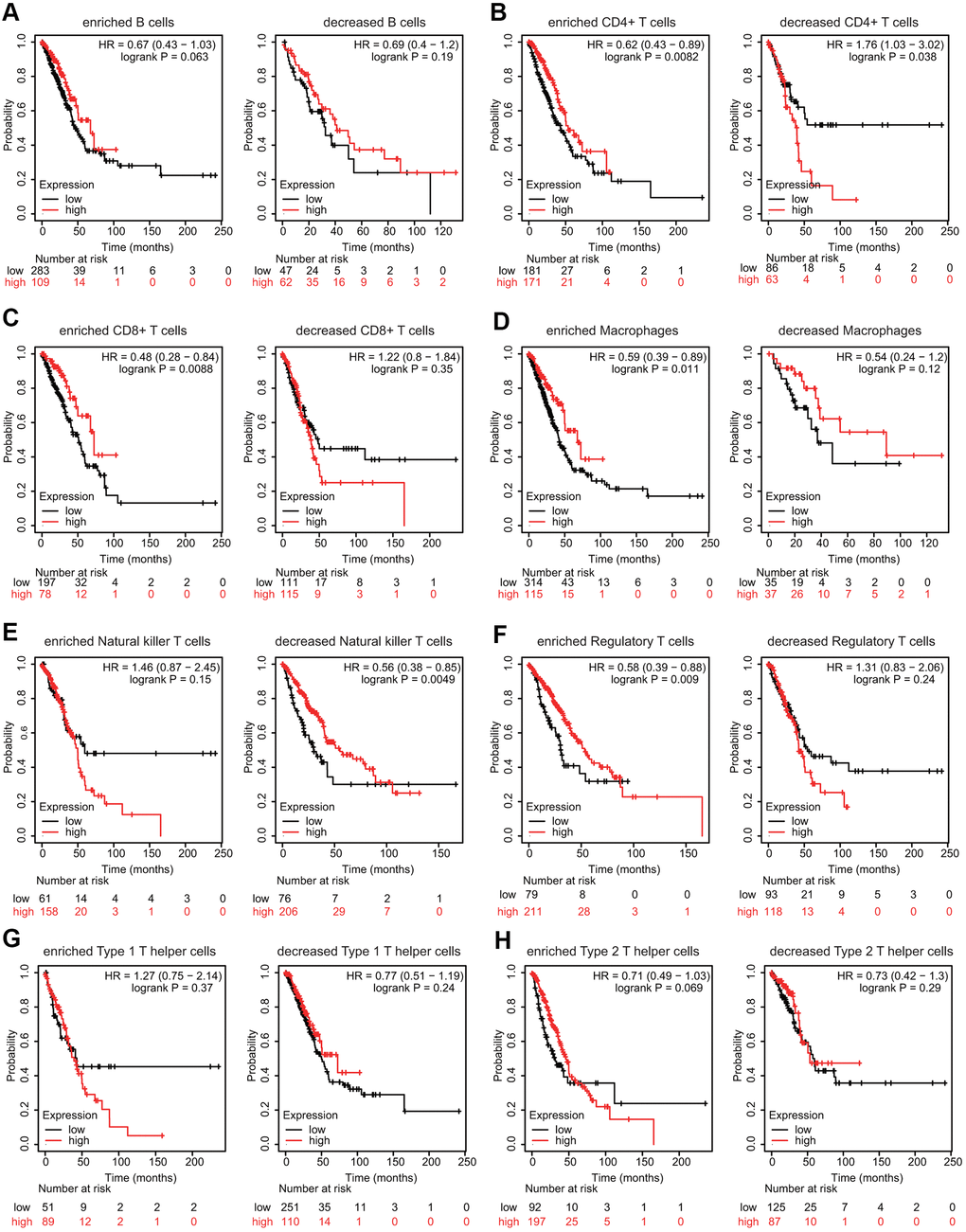 We then explored whether FPN1 expression influenced the prognosis of LUAD patients by directly affecting immune cell infiltration. Prognostic analyses based on FPN1 expression in LUAD in different immune cell subgroups were performed. Low expression of FPN1 in the enriched memory CD4+ T cell, enriched CD8+ T cell, enriched macrophage, decreased natural killer (NK) T cell, and enriched regulatory T cell (Treg) cohorts in LUAD was associated with poor prognosis (Figure 10B–10F). However, there was no significant association between low/high FPN1 expression and LUAD patient prognosis in the B cell, type 1 T helper cell, or type 2 T helper cell cohorts (Figure 10A, 10G, 10H).