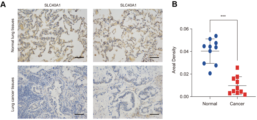 The protein expression level of FPN1 was further examined in lung cancer by IHC staining. As shown in Figure 2A, 2B, FPN1 protein expression was distinctly decreased in lung cancer.