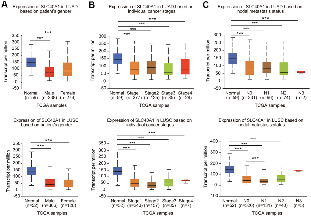 The UALCAN database (http://ualcan.path.uab.edu/) provides comprehensive cancer transcriptome and clinical patient data (pulled from TCGA). We evaluated the expression level of FPN1 to compare it not only between lung cancer and corresponding paracancerous tissues but also across various subgroups stratified by sex, pathological stage, tumor grade and other clinicopathological parameters.