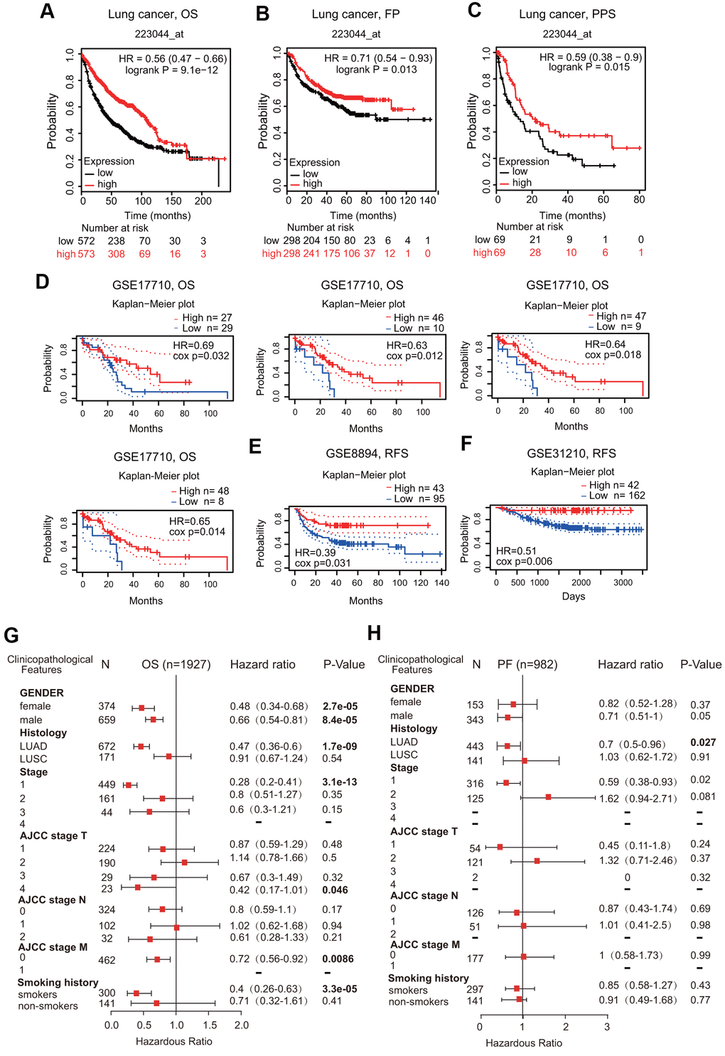 In addition to the analysis of microarray data on FPN1 from Kaplan-Meier plotter, the prognostic potential of FPN1 was further analyzed by using the PrognoScan database. Three different cohorts (GSE17710, GSE8894 and GSE31210) including different types of lung cancer demonstrated that downregulated FPN1 mRNA expression was correlated with unfavorable OS and RFS (Figure 4D–4F).
