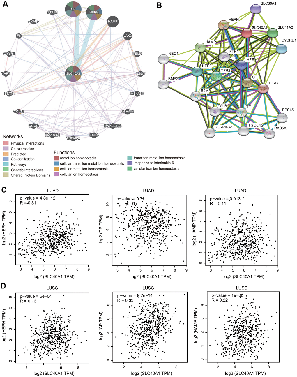 Additionally, we identified three genes from both the STRING and GeneMANIA databases: CP, HAMP and HEPH. The relationship between FPN1 and these hub proteins was evaluated in GEPIA, and the Pearson correlation coefficients were calculated. As shown in Figure 5C, 5D, FPN1 was positively coexpressed with HEPH and HAMP in LUAD and with CP, HEPH and HAMP in LUSC.