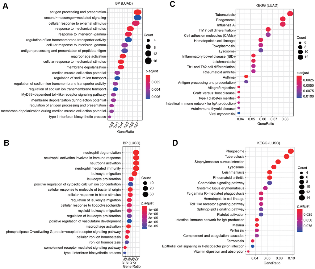 We selected the first 300 genes that were positively and significantly associated with the FPN1 gene and performed GO and KEGG analyses through the clusterProfiler package [30]. GO terms can be classified into three categories: molecular function (MF), biological process (BP) and cellular component (CC) [30]. Bubble plots representing the top 20 enriched BF, MF and CC terms of GO analysis were constructed (Figure 6A and Supplementary Figure 4). Regarding the BP terms, the results showed that in LUAD, the terms regulation of ion transmembrane transporter activity and membrane depolarization were associated with FPN1; in LUSC, the terms cellular iron ion homeostasis and complement receptor mediated signaling pathway were associated with FPN1 (Figure 6A, 6B). In addition, we found that several immune pathways were highly correlated with FPN1, including antigen processing and presentation, the cellular response to interferon-gamma, the response to interferon-gamma, antigen processing and presentation of peptide antigen, macrophage activation, and type I interferon biosynthetic process in LUAD; and neutrophil degranulation, neutrophil activation, neutrophil activation involved in the immune response, macrophage activation, neutrophil-mediated immunity, leukocyte migration, leukocyte proliferation, and type I interferon biosynthetic process in LUSC (Figure 6A, 6B). KEGG pathway analysis also revealed that FPN1 was associated with immune response-related terms, such as Th17 cell differentiation, inflammatory bowel disease, Th1 and Th2 cell differentiation, the intestinal immune network for IgA production in LUAD and Staphylococcus aureus infection, the intestinal immune network for IgA production, the chemokine signaling pathway, Fc gamma R-mediated phagocytosis, and epithelial cell signaling in Helicobacter pylori infection in LUSC (Figure 6C, 6D).