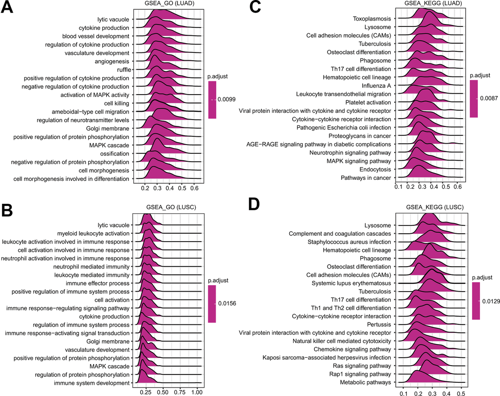 To further identify the potential mechanisms affected by FPN1 in LUAD and LUSC, GSEA was performed to estimate signaling pathways affected by FPN1 in lung cancer. As shown in Figure 7A, 7B, among the GO terms, the top 20 signaling pathways influenced by FPN1 were mainly enriched in immune-related activities, such as cytokine production, regulation of cytokine production and positive/negative regulation of cytokine production in LUAD and in leukocyte activation involved in immune response, myeloid leukocyte activation, cell activation involved in immune response, neutrophil activation involved in immune response, neutrophil mediated immunity, immune effector process, leukocyte mediated immunity, immune response-regulating signaling pathway, positive regulation of immune system process, cytokine production, regulation of immune system process, immune response-activating signal transduction, and immune system development in LUSC. Similarly, among the KEGG terms, GSEA revealed multiple immune functional gene sets that were enriched in both LUAD and LUSC, including gene sets related to cytokine-cytokine receptor interactions, Th17 cell differentiation and viral protein interactions with cytokines and cytokine receptors (Figure 7C, 7D). These results revealed that FPN1 might be a potential indicator of the status of the tumor microenvironment.