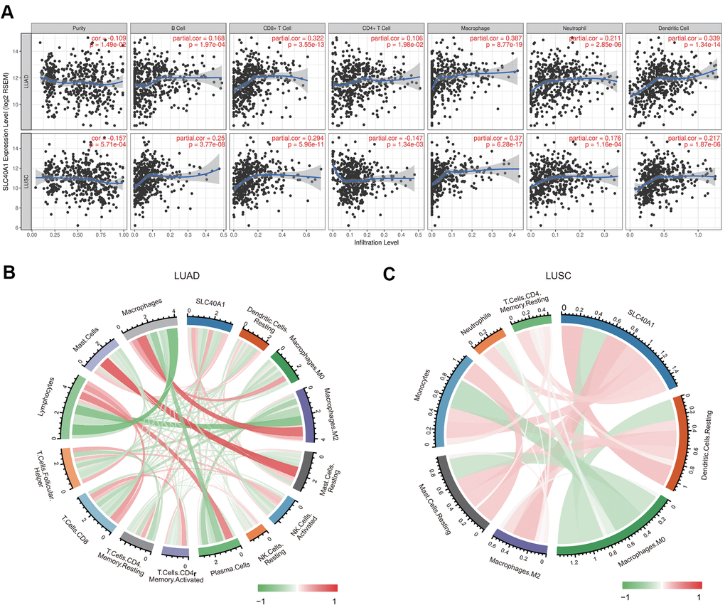 We then evaluated the relationship between FPN1 and diverse tumor-infiltrating immune cells. The results from the TIMER database suggested that FPN1 was remarkably correlated not only with tumor purity but also with the infiltrating levels of different immune cells, including CD4+ T cells, CD8+ T cells, B cells, neutrophils, macrophages and dendritic cells, in LUAD and LUSC (Figure 8A). These results suggest that FPN1 is tightly connected with the infiltration of immune cells in lung cancer, especially the infiltration of macrophages and CD8+ T cells.