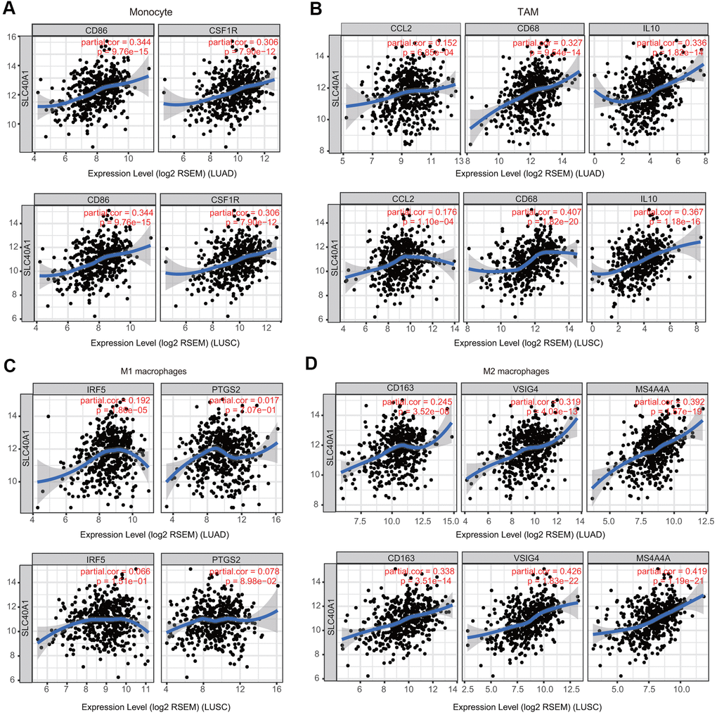Because macrophages are the immune cell type that is most strongly correlated with FPN1 expression (Figure 9), we further investigated the connections between FPN1 and immune marker sets of monocytes, tumor-associated macrophages (TAMs), M1 macrophages and M2 macrophages through GEPIA [30]. FPN1 exhibited a positive significant correlation with TAM infiltration in LUAD and LUSC tissues but not in corresponding normal lung tissues (Table 2).