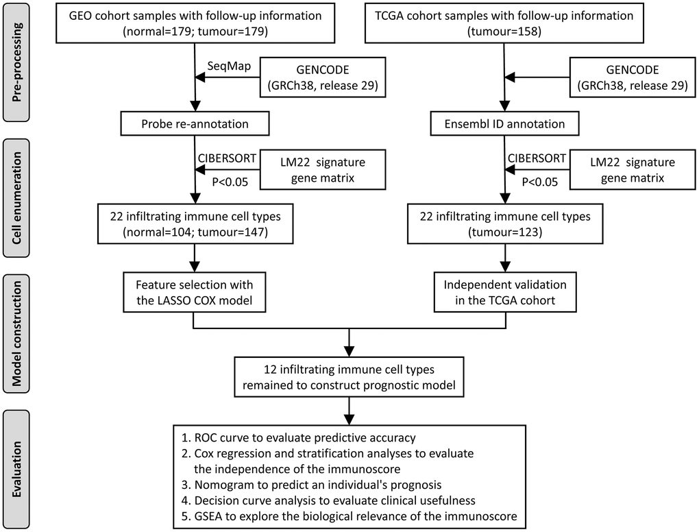 Extensive research on the effect of tumour-infiltrating immune cells on the prognosis of oesophageal cancer [5, 6] has shown that immune cell infiltration, especially the immunoscore signature based on multiple markers, may be another predictor in addition to tumour stage [7, 8]. However, the efficacy of the immunoscore signature in predicting the prognosis of oesophageal cancer relative to that of traditional predictors is unknown. Traditional methods of evaluating tumour immune infiltration include immunohistochemistry and flow cytometry. With the current technology, the ability of immunohistochemistry to simultaneously measure multiple immune markers is limited, complicating comprehensive evaluations of the immune effects of different cell types or closely related cell populations. For flow cytometry, tissue must be broken down, which may cause cell loss or damage and affect the results. Another method is to obtain high-dimensional data of gene expression profile from the cell mixture, which are then used to deduce the fraction of immune cells [9]. This approach is independent of surface markers and cell division-related human factors.