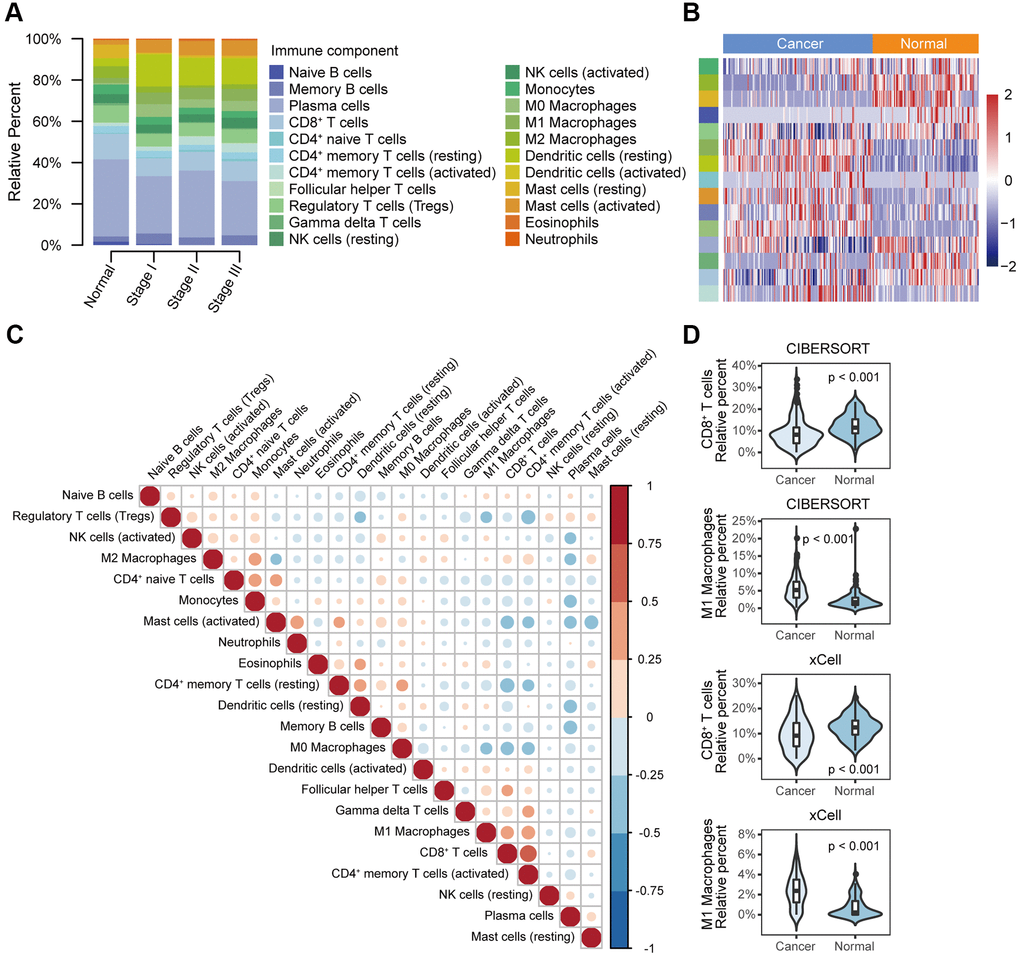 We first compared the relative abundance of 22 immune cell types between normal and oesophageal cancer tissues from the GEO database. In general, the top five immune cells in cancer and normal tissues were plasma cells, CD8+ T cells, dendritic cells (resting), regulatory T cells (Tregs), and mast cells (activated); the total fraction averaged at 64.8% in cancer tissues and 64.0% in normal tissues (Figure 2A). Moreover, dendritic cells (resting), M0 and M1 macrophages, mast cells (activated), memory B cells, CD4+ naive T cells, and CD4+ memory T cells (activated) were significantly enriched in cancer tissues relative to normal tissues, while mast cells (resting), M2 macrophages, naive B cells, CD8+ T cells, gamma and delta T cells, plasma cells, Tregs, and monocytes were significantly reduced in cancer tissues (Figure 2A, 2B, 2D). Immune cell fractions calculated with xCell showed similar results. The analysis validated the reliability of the CIBERSORT results and showed that the immune cell profile could be used as a potential prognostic marker, as it effectively distinguished normal tissue and cancer tissue (Figure 2D). Correlation analysis showed weak to moderate correlations between different immune cell types in the cancer group. CD8+ T cells were positively correlated with CD4+ memory T cells (activated) (r = 0.65, P < 0.001) and were negatively correlated with CD4+ memory T cells (resting) (r = -0.46, P < 0.001) (Figure 2C).