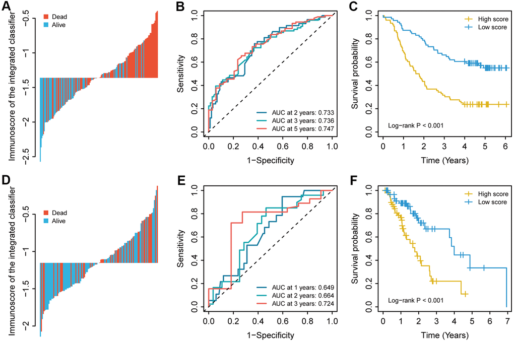 To evaluate the prognostic value of the immunoscore-based prognostic model in different populations, we used the same formula to calculate the immunoscore in the validation cohort. As in the model above, a lower immunoscore was associated with a more favourable prognosis (Figure 4D). For the validation cohort, the AUCs were 0.649 at year 1, 0.664 at year 2, and 0.724 at year 3. As in the training cohort, the patients in the validation cohort were divided into a high-immunoscore group and a low-immunoscore group based on the median score (Figure 4E). The 3-year survival rates were 66.9% (95% CI, 49.7-84.1) in the low-immunoscore group and only 22.0% (95% CI, 6.1-37.9) in the high-immunoscore group (HR, 2.93; 95% CI, 1.56-5.50; P < 0.001) (Figure 4F).