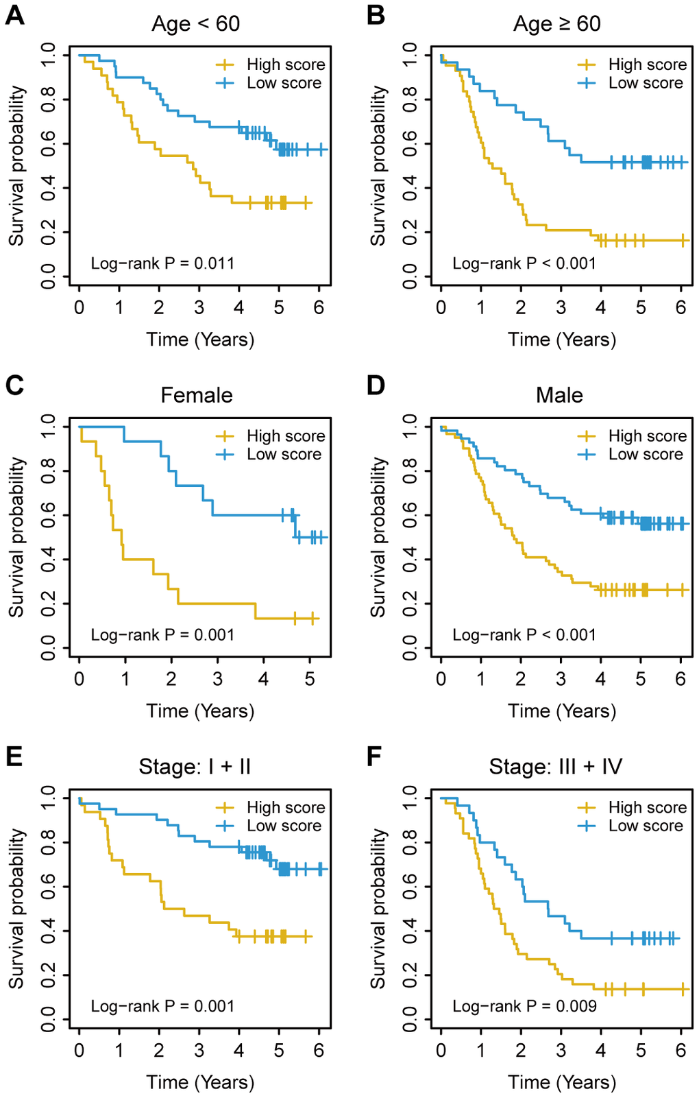 For the training cohort, each immune cell fraction was dichotomized based on the optimal cut-off value generated by the survminer package (Supplementary Table 1). The LASSO Cox regression analysis identified 12 non-zero coefficient features for the calculation of prognostic immunoscores (Figure 3A, 3B). The immunoscore calculation formula is as follows: Immunoscore = (-0.294 × Memory B cells) + (-0.567 × Plasma cells) + (-0.257 × CD8+ T cells) + (0.068 × CD4+ Memory T cells (resting)) + (0.161 × Regulatory T cells (Tregs)) + (-0.043 × Gamma delta T cells) + (-0.410 × Monocytes) + (-0.251 × M0 Macrophages) + (-0.354 × M1 Macrophages) + (0.301 × Dendritic cells (resting)) + (-0.440 × Dendritic cells (activated)) + (-0.236 × Neutrophils), where 0 or 1 is assigned based on whether the immune cell fraction is below or above the corresponding cut-off value, respectively. For the training cohort, correlation analysis showed that a lower immunoscore was correlated with a higher survival rate of oesophageal cancer patients (Figure 4A). A time-dependent receiver operating characteristic (ROC) curve was used to evaluate the prognostic accuracy of 12 immune cell types over time. The AUC of the prognostic model was 0.733 at year 2, 0.736 at year 3, and 0.747 at year 5 (Figure 4B). Next, the training cohort was divided into a high-immunoscore group and a low-immunoscore group based on the median score (hazard ratio [HR], 2.70; 95% confidence interval [CI], 1.74-4.20; P < 0.001), which had 5-year survival rates of 23.7% (95% CI, 14.1-33.2) and 55.0% (95% CI, 43.0-67.0), respectively (Figure 4C). Stratification analysis of different clinical characteristics showed that immunoscore was significantly correlated with survival status (Figure 5 and Supplementary Table 2).