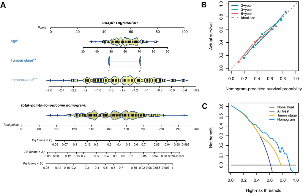 Cox regression analysis was performed to determine the immunoscore, which showed that age and tumour stage were independent predictors of the prognosis of oesophageal cancer. For quantitative prognostic predictions, we used the training cohort to build a model containing the above independent predictors, which is presented as a nomogram (Figure 6A). The calibration curve demonstrated good agreement between the prediction model and the ideal model for the prognosis of oesophageal cancer (Figure 6B). The C-index of the nomogram was 0.718 (95%, 0.668-0.768) in the training cohort. The C-index of the prediction model was 0.716 (95%, 0.612-0.820) in the validation cohort. Decision curve analysis showed that when the threshold probability was greater than 0.3, the use of the plotted nomogram for prognostic prediction had more net benefits than indiscriminate treatment or no treatment, suggesting that the nomogram was clinically useful (Figure 6C).