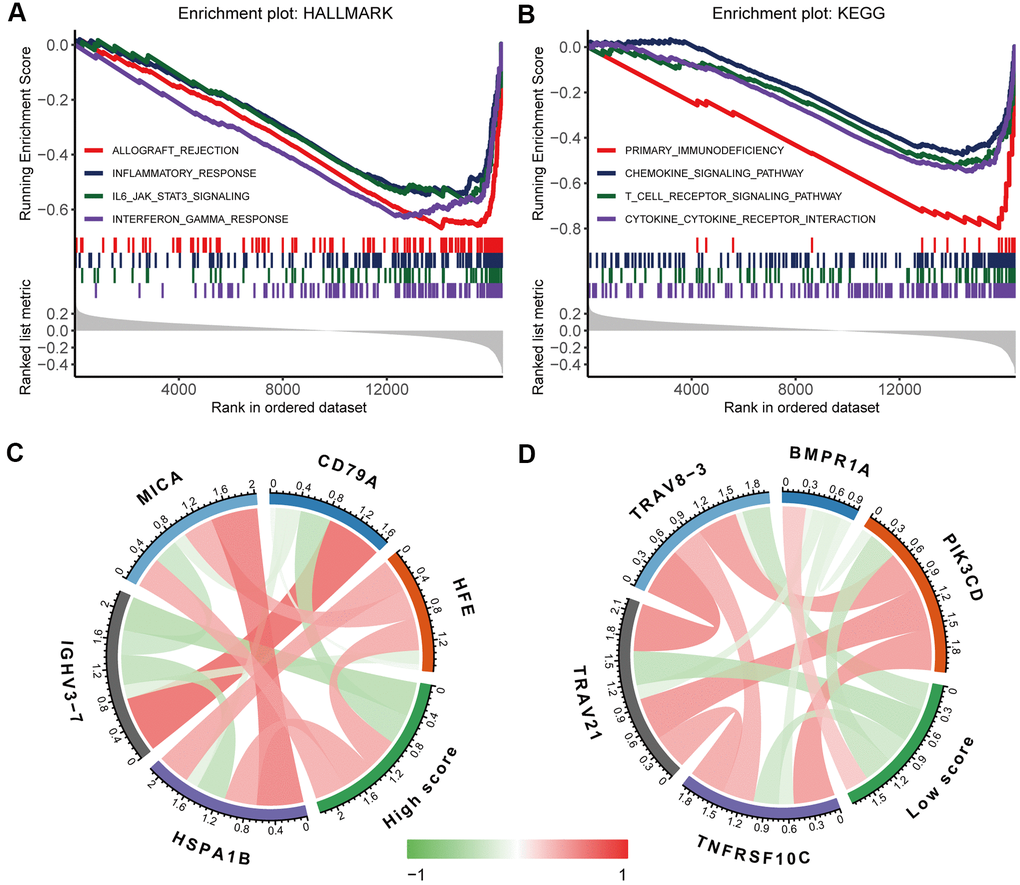 To investigate biological pathways related to the immunoscore signature, we performed GSEA using the R clusterProfiler package on the gene expression profile [29]. The h.all.v7.1.symbols.gmt and c2.cp.kegg.v7.1.symbols reference gene set files used in this study were downloaded from the Molecular Signature Database (https://www.gsea-msigdb.org/gsea/index.jsp). Gene sets with an adjusted P < 0.05 after 1000 permutations were considered significantly enriched.