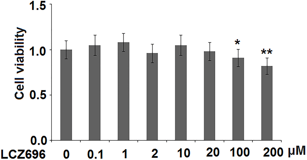 LCZ696 is a co-crystallized complex with a combination of sacubitril and valsartan, in a one-to-one molar ratio, one LCZ696 molecule consists of six sacubitril anions, six valsartan anions, 18 sodium cations, and 15 molecules of water. The molecular structure of LCZ696 is shown in Figure 1. Valsartan is an angiotensin II receptor blocker and sacubitril is activated to be a neprilysin inhibitor. To determine the cytotoxicity of LCZ696, HUVECs were treated with a series of doses of LCZ696 ranging from 0.1 to 200 μM for 24 hours. Results show that when the concentration of LCZ696 was lower than 100 μM, it did not affect the cell viability of HUVECs. However, when the concentration of LCZ696 was at 100 and 200 μM, it significantly reduced the cell viability by 9% and 18%, respectively (Figure 2). Based on these observations, we treated HUVECs with 10 and 20 μM LCZ696 in the subsequent experiments.