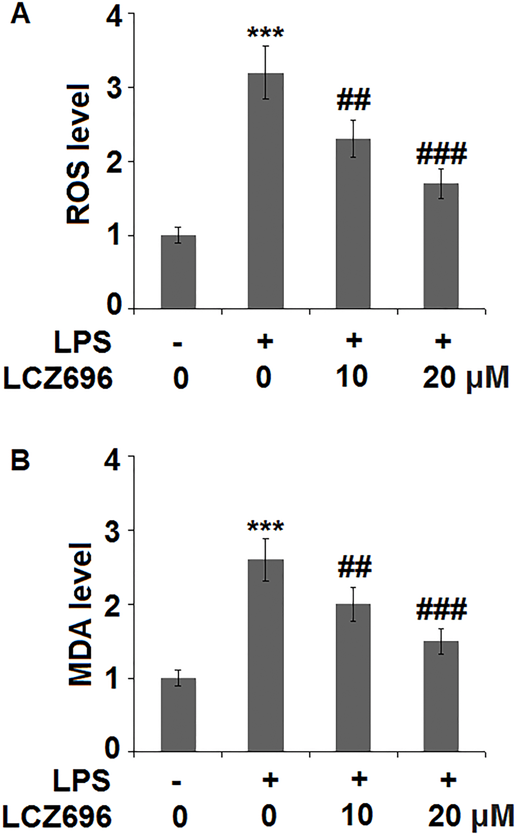 Subsequently, the effect of LCZ696 in oxidative stress in endothelial cells was examined. As shown in Figure 3A, LPS treatment alone induced about 3.2-fold high of ROS, while the addition of 10 and 20 μM of LCZ696 suppressed LPS-induced ROS production to 2.3- and 1.7-fold, respectively. Meanwhile, our data shows that LCZ696 had a similar suppressive effect on another oxidative marker-MDA. As shown in Figure 3B, LPS induced about 2.6-fold high MDA activity, while the presence of two doses of LCZ696 reduced its activity only to 2- and 1.5-fold, respectively.