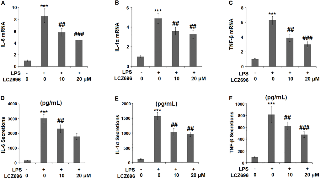 To evaluate the consequence of LCZ696 on LPS-induced inflammation, the expression profiles of several key pro-inflammatory cytokines were examined. At mRNA level, LPS alone induced elevated transcription of IL-6, IL-1α, and TNF-β, however, the presence of two doses of LCZ696 showed notable suppression on the transcription of these cytokine genes (Figure 4A–4C). Through ELISA assay, the suppression by LCZ696 of the production of these cytokines was confirmed (Figure 4D–4F). LPS treatment stimulated the secretions of IL-6, IL-1α, and TNF-β, causing an increase from 166.8, 115.3, and 93.1 pg/ml to 3025.6, 1568.1, and 817.9 pg/ml, respectively. However, 10 μM LCZ696 reduced the secretions of these pro-inflammatory cytokines to 2321.7, 1025.6, and 623.5 pg/ml, which were further decreased to 1786.5, 735.5, and 476.2 pg/ml by 20 μM LCZ696, respectively.