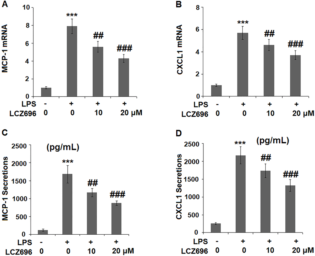 The expression levels of two primary chemokines CXCL1 and MCP-1 were also examined. At mRNA level, LPS alone caused a 7.9- and 5.7-fold high of MCP-1 and CXCL1. However, higher doses of LCZ696 reduced their induction to only 4.3- and 3.7-fold, respectively (Figure 5A, 5B). Similarly, LPS treatment increased the protein levels of MCP-1 and CXCL1 from 123.5 and 256.8 pg/ml to 1683.6 and 2167.3 pg/ml, which were reduced to 1173.4 and 1735.8 pg/ml by 10 μM LCZ696, and to 875.2 and 1325.8 pg/ml by 20 μM LCZ696, respectively. Thus, LCZ696 exerted a strong inhibitory effect against LPS-induced expression of pro-inflammatory chemokines.