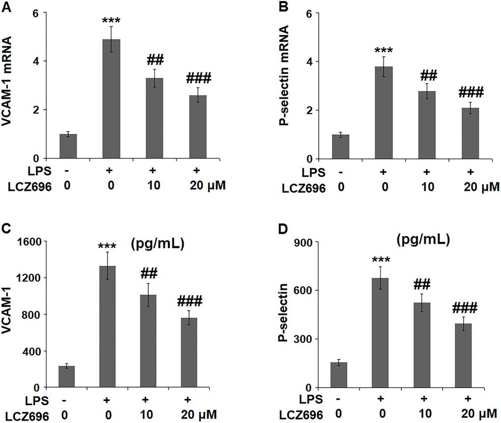 Endothelial cells expressed several cell adhesion molecules upon inflammatory stimuli, including VCAM-1 and P-selectin. At mRNA level, LPS alone induced 4.9 and 2.8-fold high of VCAM-1 and P-selectin. But a higher concentration of LCZ696 was able to reduce their transcription levels to only 2.6- and 2.1-fold, (Figure 6A, 6B) respectively. The results in Figure 6C and Figure 6D show that the protein levels of VCAM-1 and P-selectin were significantly increased from 235.6 and 156.5 pg/ml to 1331.8 and 678.1 pg/ml, respectively, by exposure to LPS alone. However, 10 and 20 μM LCZ696 reduced the protein levels of VCAM-1 to 1012.5 and 763.3 pg/mL, and P-selectin to 523.8 and 395.6 pg/mL, respectively.