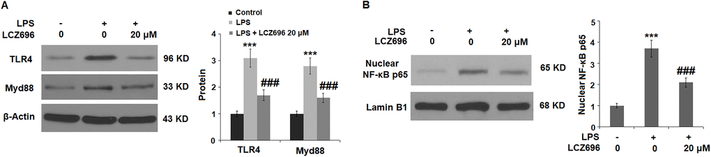 Lastly, the potential molecular pathways that involved LCZ696 were explored. We focused on the TLR4/Myd88 sensor and nuclear NFκB p65 signals. As shown in Figure 8A, LPS alone induced 3.1- and 2.8-fold TLR4 and Myd88 expressions, but LCZ696 was able to reduce their expressions to 1.6- and 2.1-fold, respectively. As shown in Figure 8B, LPS alone induced increased nuclear expression of NFκB p65 to 3.7-fold, while LCZ696 reduced its expression to 2.1-fold only.
