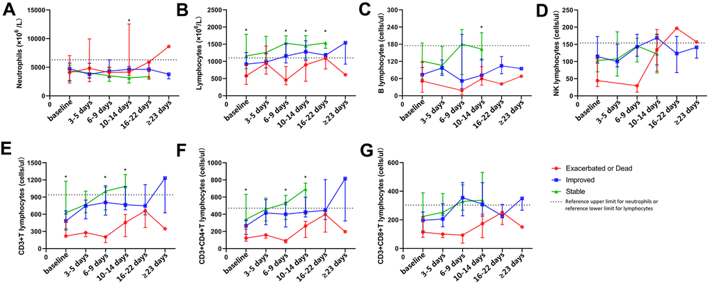 According to disease progression, patients with COVID-19 were divided into three groups, including the stable group, improved group, and exacerbated or dead group. This study focused on elucidating the dynamic characteristics of neutrophil, lymphocyte, and T-lymphocyte subsets in COVID-19 patients with different outcomes, and it was observed that the number of lymphocytes, CD3+ T cells, and CD3+CD4+ T cells in the stable and improved groups was significantly more than that in the exacerbated or dead group at baseline, 6-9 days after baseline, and 10-14 days after baseline (P < 0.05, Figure 2). Peripheral total lymphocytes and T-cell subsets in patients with disease exacerbation were all less than the lower limit of their references during the observation period, and those in patients with a stable or improved condition gradually increased after treatment, even surpassing the upper limit of their references at 6-9 days after baseline. No dynamic characteristic of peripheral B cells or NK cells in patients with different outcomes was observed. Figure 3 shows that peripheral CD3+CD4+ or CD3+CD8+ T cells gradually increased during hospitalization, especially 6-9 days after baseline. The period of disease exacerbation could be delayed for more than 2 weeks after admission, while the period of disease improvement was shortened to 1 week after admission. On the contrary, with decreasing peripheral CD3+CD4+ or CD3+CD8+ T cells 6-9 days after baseline, COVID-19 exacerbation quickly occurred within 1 or 2 weeks of admission.