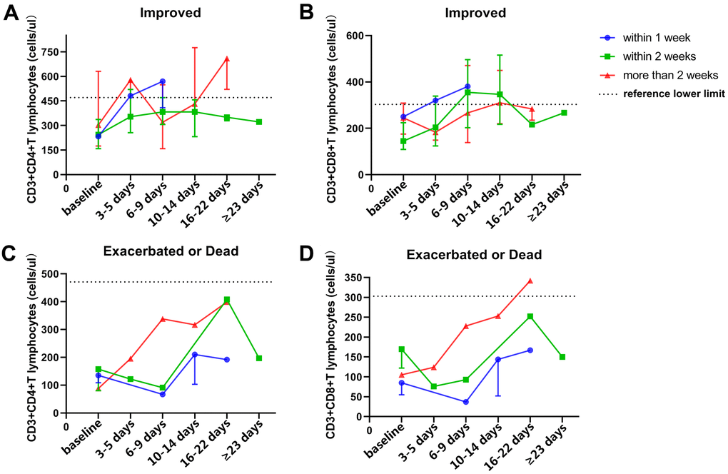 All patients were treated with basic therapeutics, including symptomatic management, oxygen inhalation, interferon atomization, antiviral therapy, or antibiotic therapy in patients with suspected bacterial infection, and mechanical ventilation and glucocorticoid treatment were used when necessary. Patients with a peripheral CD3+CD4+ T-cell count less than 350 cells/μL were treated with thymalfasin. Complete blood count and peripheral lymphocyte subsets were determined in all patients and dynamically monitored in 59 cases. The dynamic points included baseline (within 3 days of admission), 3-5 days after baseline, 6-9 days after baseline, 10-14 days after baseline, 16-22 days after baseline, and more than 23 days after baseline. All laboratory results and clinical information are described in Table 1 and Table 2, respectively.