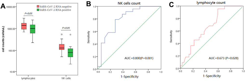Among 48 follow-up patients, 19 patients tested negative for SARS-CoV-2 nucleic acid after therapy. Compared with patients positive for SARS-CoV-2 after therapy, more baseline peripheral lymphocytes and NK cells could be observed in SARS-CoV-2-negative patients after therapy (P < 0.05) (Figure 4A). Additionally, there was no significant difference in other laboratory indicators between SARS-CoV-2-negative patients and SARS-CoV-2-positive patients after therapy. An ROC analysis showed that the AUCs of baseline peripheral NK cells and lymphocytes for differentiating the state of SARS-CoV-2 clearance after therapy were 0.800 and 0.673, respectively (P < 0.05) (Figure 4B, 4C). The optimal cut-off value of NK cells, defined by the Youden index, was 105 cells/μL (SEN: 79.2% and SPE; 72.2%), while the optimal cut-off value of lymphocytes was 875 cells/μL (SEN: 95.5% and SPE: 40.5%).