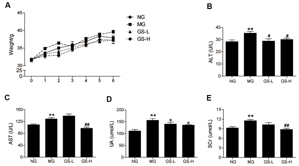 As shown in Figure 1A, no significant differences in body weight were observed between the four groups during the six-week intervention. The effects of GSLS on liver and kidney function in D-gal-induced aging mice were examined based on the measured levels of ALT, AST, UA, and SCr in serum. As shown in Figure 1B–1E, the MG mice exhibited a marked increase in the levels of ALT, AST, UA, and SCr (p < 0.01) compared to NG mice. The levels of ALT, AST, UA, and SCr were significantly lower in the GS-L and GS-H groups than in the MG. These results demonstrate that GSLS are safe. GSLS do not effect body weight or burden the livers and kidneys of aging mice; they may even improve liver and kidney function.
