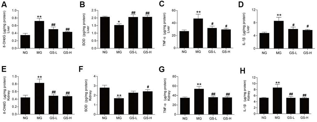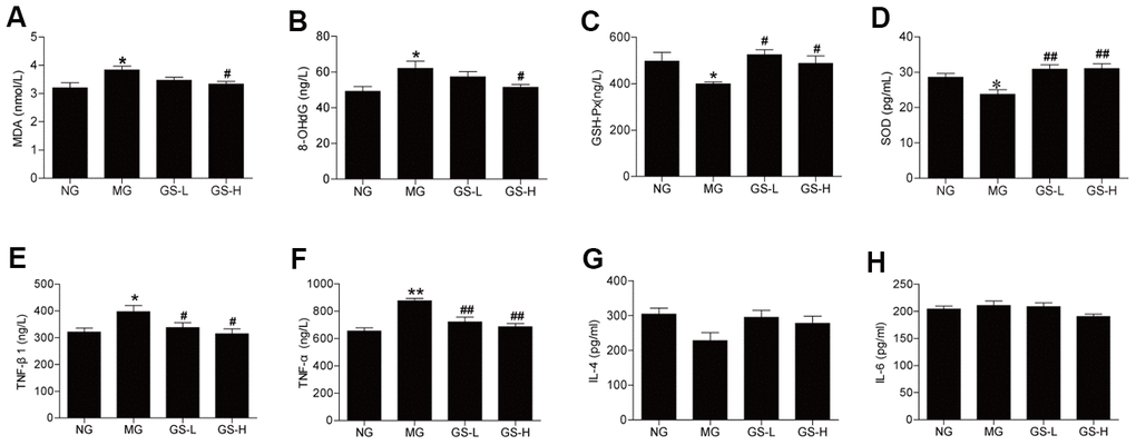 The effects of GSLS on oxidative stress markers in mice serum were examined based on the measured levels of MDA, 8-OHdG, SOD and GSH-Px. The levels of MDA and 8-OHdG in serum were significantly elevated in MG mice compared to in NG mice (p < 0.05; Figure 3A, 3B). High-dose GSLS treatment significantly reduced the MDA and 8-OHdG levels compared to the MG. The levels of GSH-Px and SOD in serum were lower in MG mice than in NG mice (p< 0.05; Figure 3C, 3D). GSLS treatment significantly increased the levels of GSH-Px and SOD in serum compared to the MG.