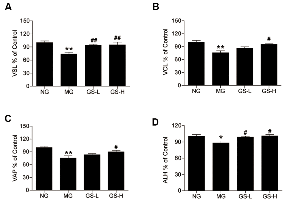 As shown in Figure 4, all sperm motility parameters (VSL, VCL, VAP and ALH) were lower in MG mice than in NG mice. Treatment with GSLS significantly increased the levels of VSL, VCL, VAP and ALH in mouse sperm compared to the MG.