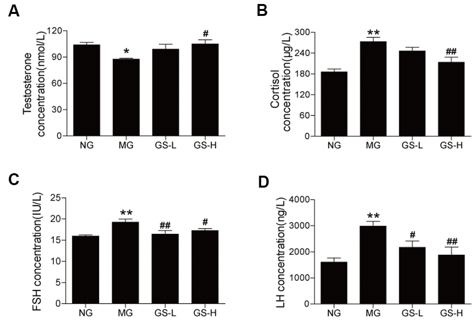 The MG mice had a lower level of testosterone in serum than the NG mice (p < 0.05, Figure 5A). GSLS treatment significantly increased the testosterone level in the serum of mice compared to the MG. The levels of hormones (cortisol, FSH and LH) in the serum were significantly higher in MG mice than in NG mice (p< 0.05; Figure 5B–5D). GSLS treatment significantly decreased the levels of cortisol, FSH and LH compared to the MG.