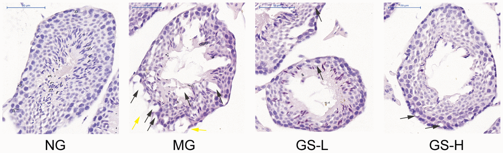 As shown in Figure 6, no histopathological change of seminiferous tubules was observed in the control group. Well-defined spermatogenic cells were lined on a thin basement membrane. The spermatogenic cells were arranged orderly and in clear layers. All levels of spermatogenic cells were observed. The Sertoli cells were normal in shape and embedded in the basement membrane and spermatogenic cells. In contrast, significant changes were seen in the testes of mice exposed to D-gal. The structure of seminiferous tubules was damaged, the vacuole was denatured, the spermatogenic epithelium became thinner and the number of layers decreased. The number of spermatogenic cells was decreased and the arrangement was loose. Compared with D-gal group, GSLS treatment improved the histological changes of testis and gradually increased germinal layer to restore spermatogenesis. While when compared with the control group, there was no mature sperm in the lumen. Taken together, D-gal treatment induced histopathological changes of testis, and GSLS intervention improved these alterations.