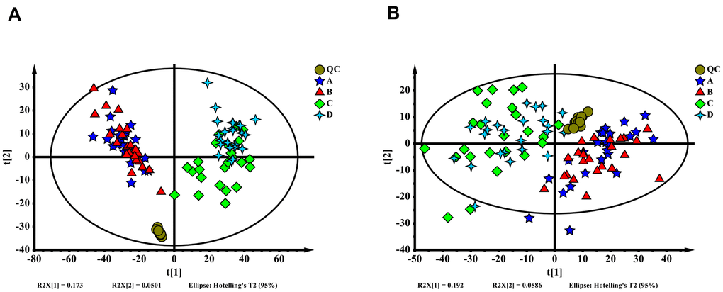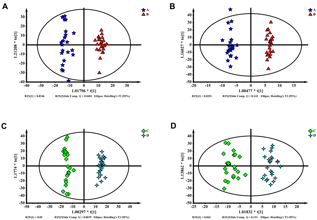 In a comparison of differential metabolites in groups A–B and C–D, we found similar variation tendencies. The differential metabolites are shown in Supplementary Tables 1, 2. Most of the metabolites showing similar trends were not identified as significant differential metabolites. However, phosphohydroxypyruvic acid rates were high in groups A–B and C–D in ESI+ ion mode.
