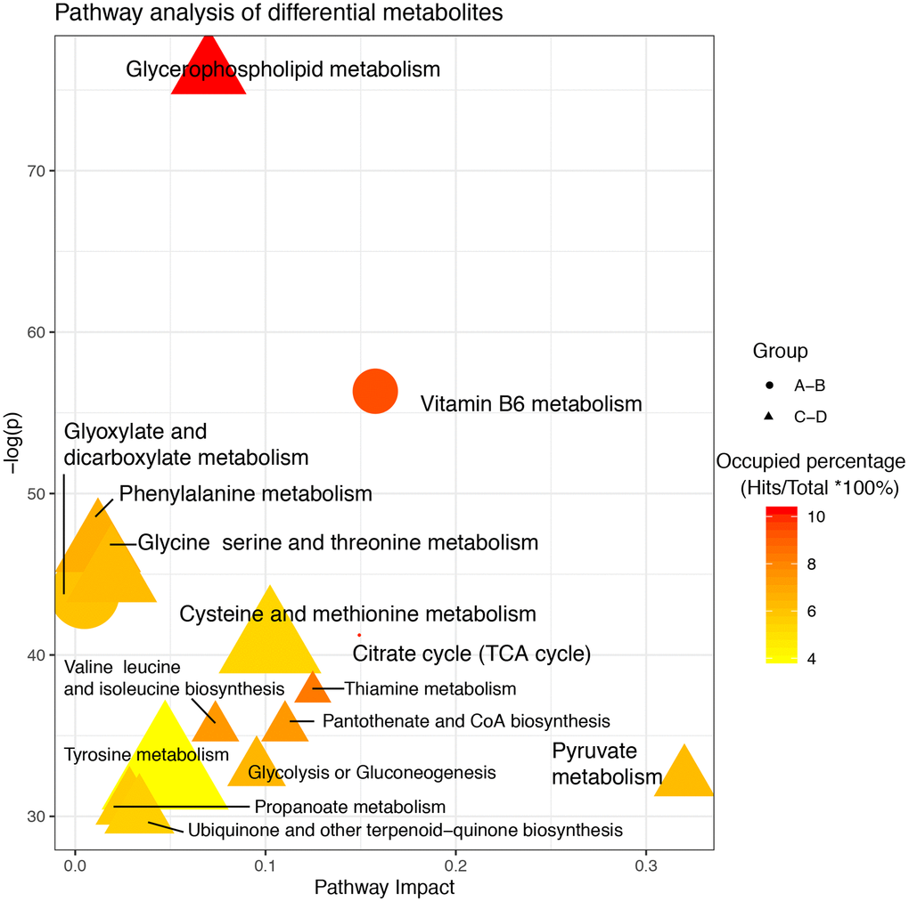 After screening differential metabolites, the enriched pathways were further analyzed (Figure 3). In groups A–B, glyoxylic acid and dicarboxylic acid metabolism, vitamin B6 metabolism, and pyruvate metabolism were identified as significantly enriched pathways. Two of these three pathways showed high occupancy percentages (>90%). Notably, glycerophospholipid metabolism was the most significantly enriched pathway in groups C–D and showed the highest occupancy percentage (>90%). The phosphohydroxypyruvic acid selected only in groups C–D was enriched in glycine, serine, and threonine metabolism.