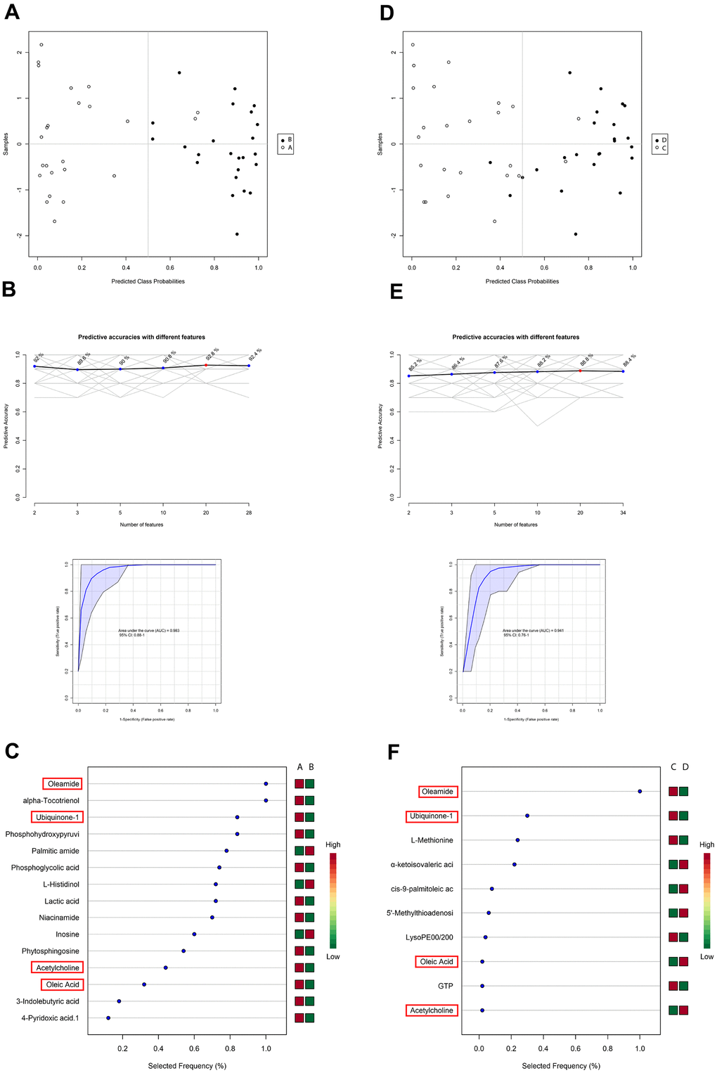 In both the A–B and C–D SVM models, there were four metabolites calculated as important features (Figure 4C and 4F). Oleamide, ubiquinone-1, acetylcholine, and oleic acid could be used to separate patients exhibiting enhanced and delayed postoperative recovery both in the PACU and at 24 hours after surgery. Thus, these metabolites could be used as potential biomarkers to predict patients’ postoperative recovery state according to the SVM results. Among all these features, oleamide had the highest selected frequency, and ubiquinone-1 also ranked among the top 3 in both models.
