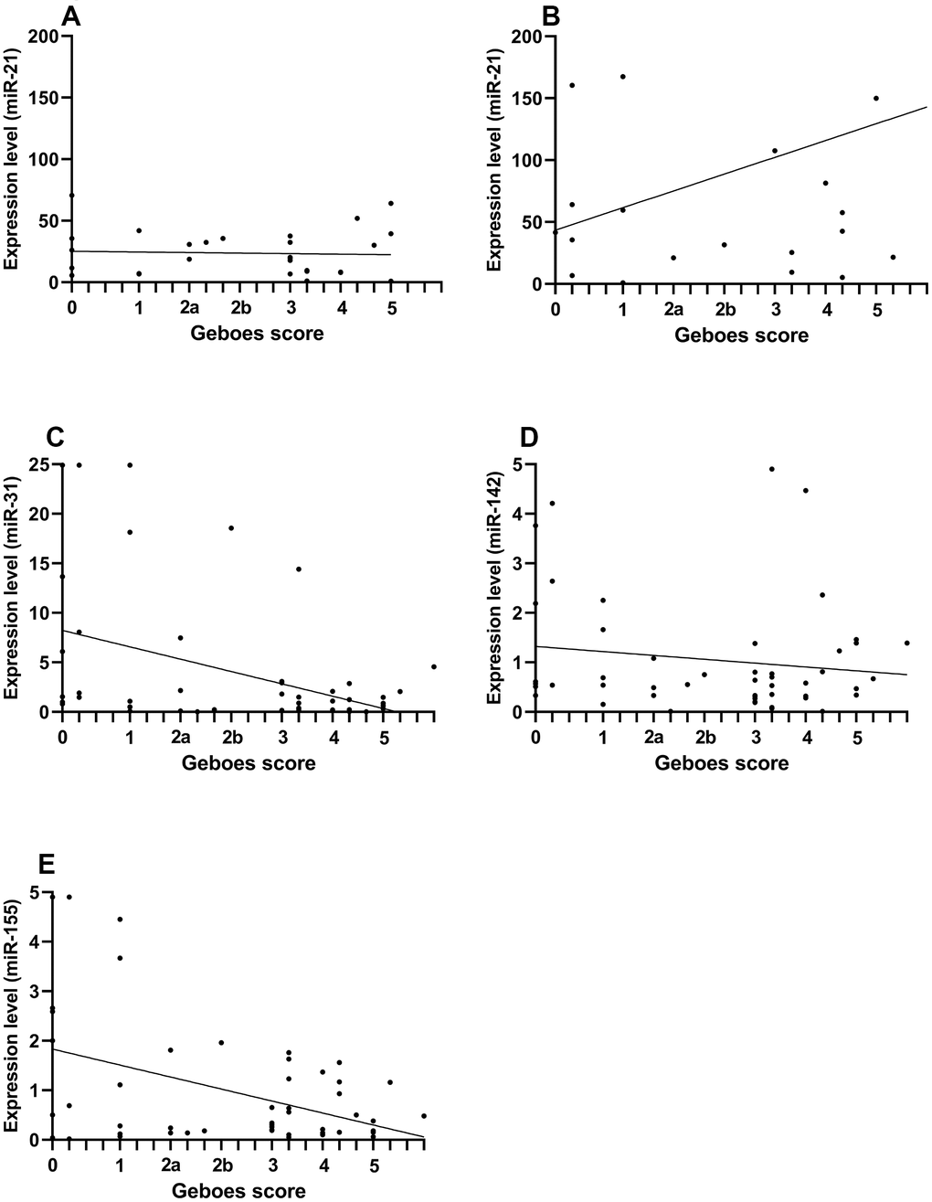The expression levels of miR-21 in pUC patients were significantly lower than in aUC patients (relative median fold difference [IQR]: 19 [8-36] and 50 [21-129] in pUC and aUC, respectively, p=0.003). No difference was found between patients in histological assessed remission compared to those with active disease for both pUC and aUC study groups. Among the aUC, males had higher expression levels than females (relative median fold difference [IQR]: 150 [43-203] vs 32 [21-58], p=0.02). No correlation was found between miR-21 measured by RT-qPCR and Geboes score (Figure 1).