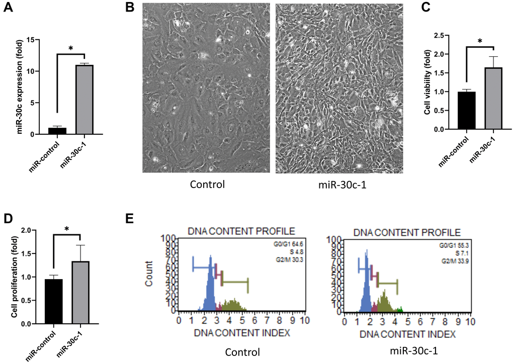 miR-30c level was elevated in miR-30c-1-treated cells compared with miR-control (p < 0.001, Figure 1A). hCEC size decreased with miR-30c-1-treatment compared with control (p < 0.001, Figure 1B). Cell viability and proliferation rate were elevated in miR-30c-1-treated cells compared with miR-control (p < 0.001 and 0.040; Figure 1C–1D). The cellular abundance in S-phase of cell cycle was higher in miR-30c-1-treated cells compared with miR-control (p = 0.001; Figure 1E).