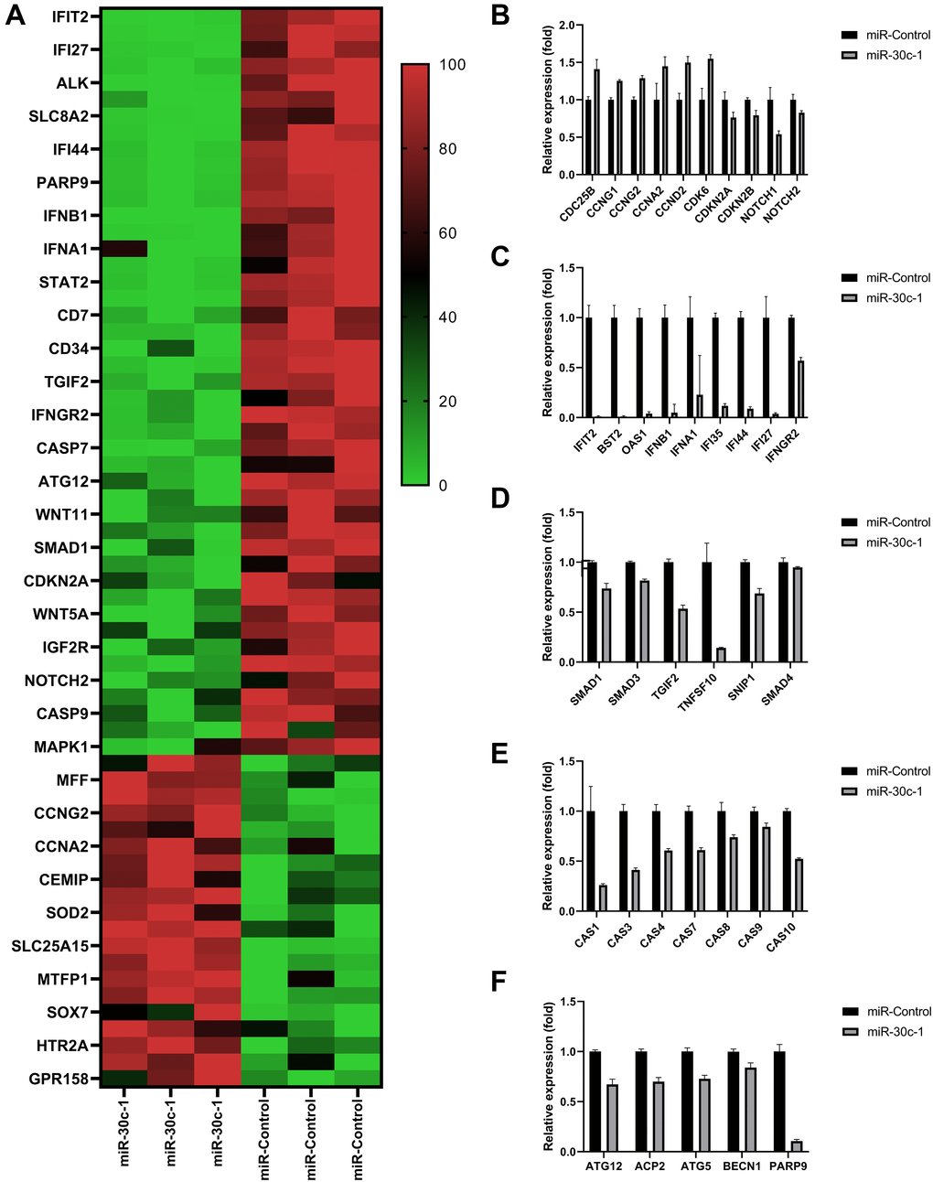 Normalized read counts and fold changes are shown in Figure 2A and Table 1. Relative expressions of cell proliferation-associated genes were elevated and relative expressions of inhibitor genes were reduced in miR-30c-1-treated cells compared with miR-control (p < 0.05 for all, Figure 2B, Table 1). Interferon (IFN)-associated genes (Figure 2C), TGF-β-associated genes (Figure 2D), caspases genes (Figure 2E) and autophagy-associated genes (Figure 2F) were decreased in miR-30c-1-treated cells compared with miR-control (p < 0.05 for all).