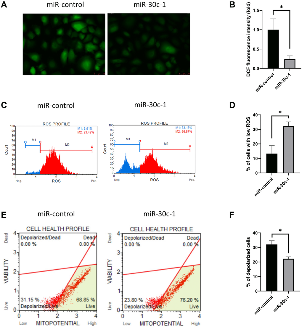 DCF fluorescence intensity decreased in miR-30c-1-treated cells compared with miR-control (p < 0.001; Figure 3A–3B). Intracellular oxidative stress level measured by Muse analyzer decreased in miR-30c-1-treated cells compared with miR-control (p = 0.006; Figure 3C–3D). The mitochondrial membrane potential increased in miR-30c-1-treated cells compared with miR-control (p < 0.001; Figure 3E–3F).