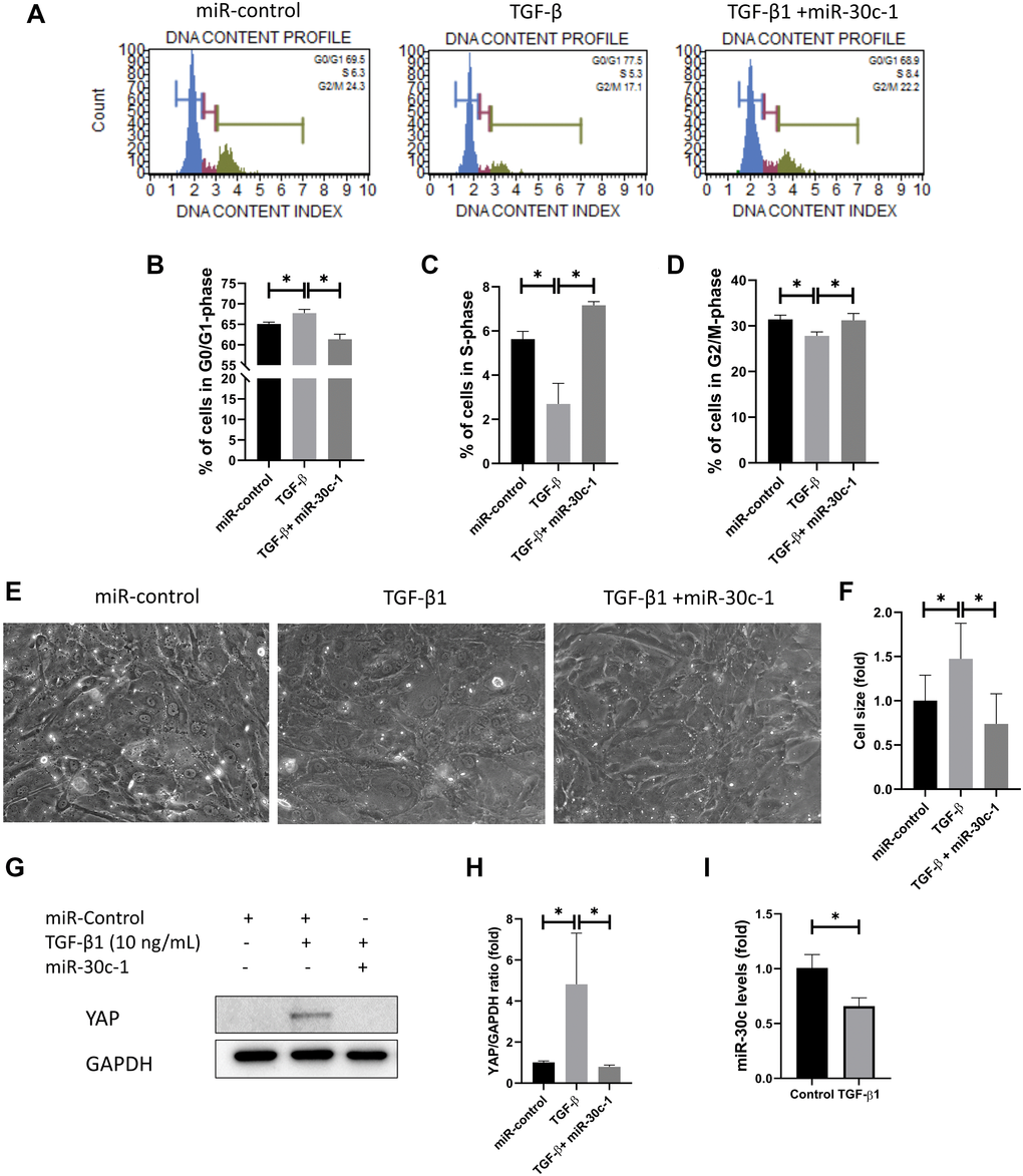 Cell cycle analysis was conducted using quantitation of DNA content (Figure 4A). Cell cycle analysis presented that the cellular abundance in G0/G1 phase was elevated following TGF-β1 treatment, but it was not elevated with miR-30c-1 treatment (p = 0.010; Figure 4B). The cellular abundance in S-phase and in G2/M-phase was reduced with TGF-β1 treatment compared with miR-30c-1 treatment (p = 0.001; Figure 4C–4D). TGF-β1 stimulation also significantly increased cell size (p = 0.017) compared with miR-30c-1 treatment (p = 0.001; Figure 4E–4F). TGF-β1 caused an elevation in yes-associated protein (YAP) levels compared with miR-30c-1 treatment (p = 0.041 and p = 0.033, respectively; Figure 4G–4H). miR-30c-1 levels were reduced in treatment with TGF-β1 (p = 0.041, Figure 4I).