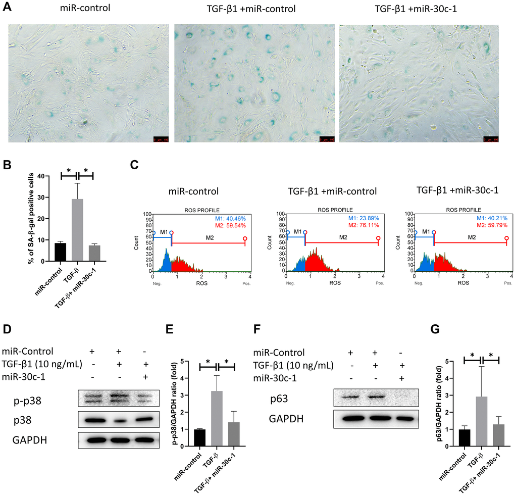 The ratio of SA-β-gal-stained cells was elevated with TGF-β1 treatment (p = 0.008), which did not occur when miR-30c-1 was present (p = 0.007; Figure 5A–5B). Intracellular oxidative stress was increased following TGF-β1 treatment (p = 0.035) but was ameliorated by miR-30c-1 (p = 0.002; Figure 5C). Additionally, TGF-β1 treatment also increased the levels of p-p38 and p63 (p = 0.013 and p = 0.019, respectively), but these did not increase when miR-30c-1 was present (p = 0.047 and p = 0.043, respectively; Figure 5D–5G).