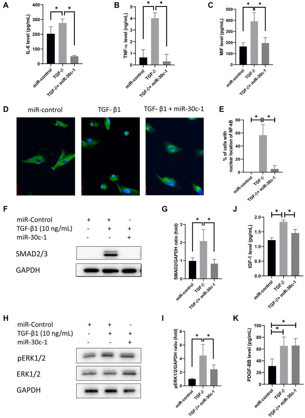 Evaluation of SASPs in conditioned medium demonstrated that the levels of IL-6, TNF-α, and MIF increased after TGF-β1 treatment (p = 0.030, p < 0.001, and p < 0.010, respectively), which did not occur following miR-30c-1 treatment (p = 0.005, p < 0.001, and p = 0.021, respectively; Figure 6A–6C). The percentage of NF-κB located in the nucleus was elevated by TGF-β1 but was ameliorated by miR-30c-1 (p = 0.001 and p = 0.002, respectively; Figure 6D–6E). TGF-β1 also elevated the levels of pERK1/2 and SMAD2/3 (p = 0.003 and p = 0.012, respectively) but not when miR-30c-1 was present (p = 0.048 and p = 0.013; Figure 6F–6I). Additionally, IGF-1 and PDGF-BB levels were also increased with TGF-β1 treatment (p = 0.001 and p = 0.032, respectively) but not in the presence of miR-30c-1 (p = 0.183 and 0.044; Figure 6J–6K).