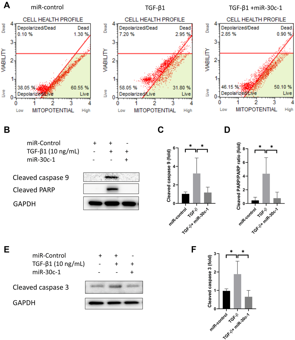 TGF-β1 treatment promoted the depolarization of mitochondrial membrane potential (p = 0.014) but this effect was eliminated with miR-30c-1 treatment (p = 0.003, Figure 7A). In addition, TGF-β1 elevated the levels of cleaved caspase 9, cleaved PARP, and cleaved caspase 3 (p = 0.034, p = 0.012, and p = 0.049, respectively), but the presence of miR-30c-1 ameliorated this effect (p = 0.047, p = 0.019, and p = 0.011, respectively; Figure 7B–7F).