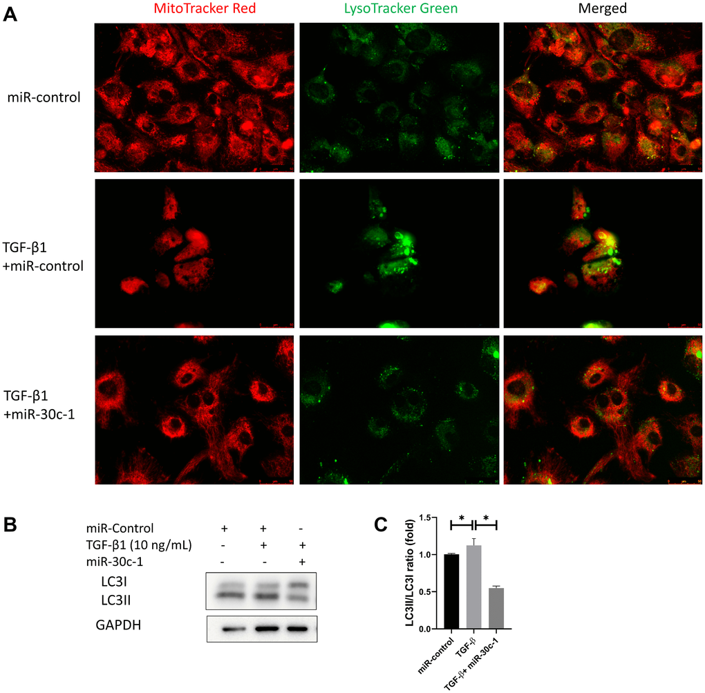 Lysosomes (green stain) became enlarged and prominent following TGF-β1 treatment, while this effect was removed with miR-30c-1 treatment (Figure 8A). The level of LC3II also increased after TGF-β1 treatment (p < 0.001) but not when miR-30c-1 was present (p < 0.001; Figure 8B–8C).