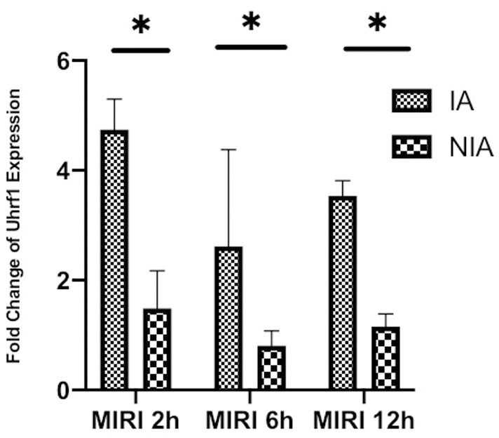 The mice were divided into three groups, which were subjected to myocardial ischemia for 30 minutes and then reperfusion for 2, 6, or 12 hours. The expression of Uhrf1 in the infarcted areas (IA) and non-infarcted areas (NIA) were detected by qRT-PCR (Figure 1). The Uhrf1 level in the non-infarcted areas was significantly lower than the infarcted areas at 2, 6 and 12 hours after myocardial ischemia-reperfusion in vivo.